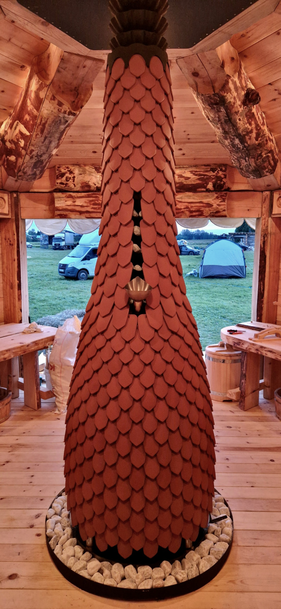 Сочетает в себе функциональность и эстетику, единство технологического и природного начал. У этой печи нет привычных плоских или цилиндрических поверхностей — поверхности декора трёхмерные и плавные.